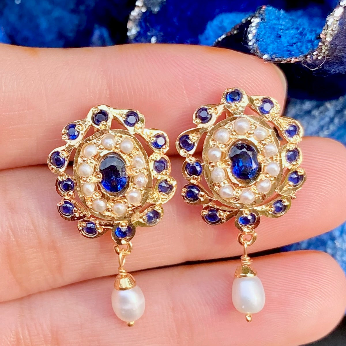 Featuring a pair of jadau studs made on sterling silver with gold plating. The studded stones comprise freshwater pearls and navy blue stones that resemble blue sapphires.