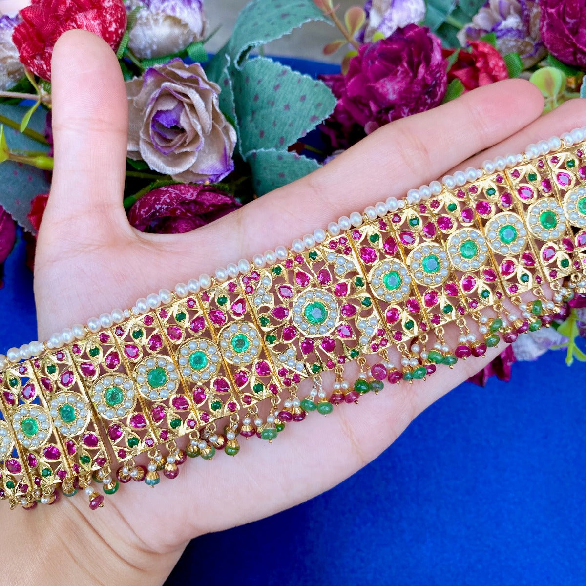 Jadau choker necklace set made in 92.5 gold plated silver, worthy of being worn with a bridal lehenga or attire.