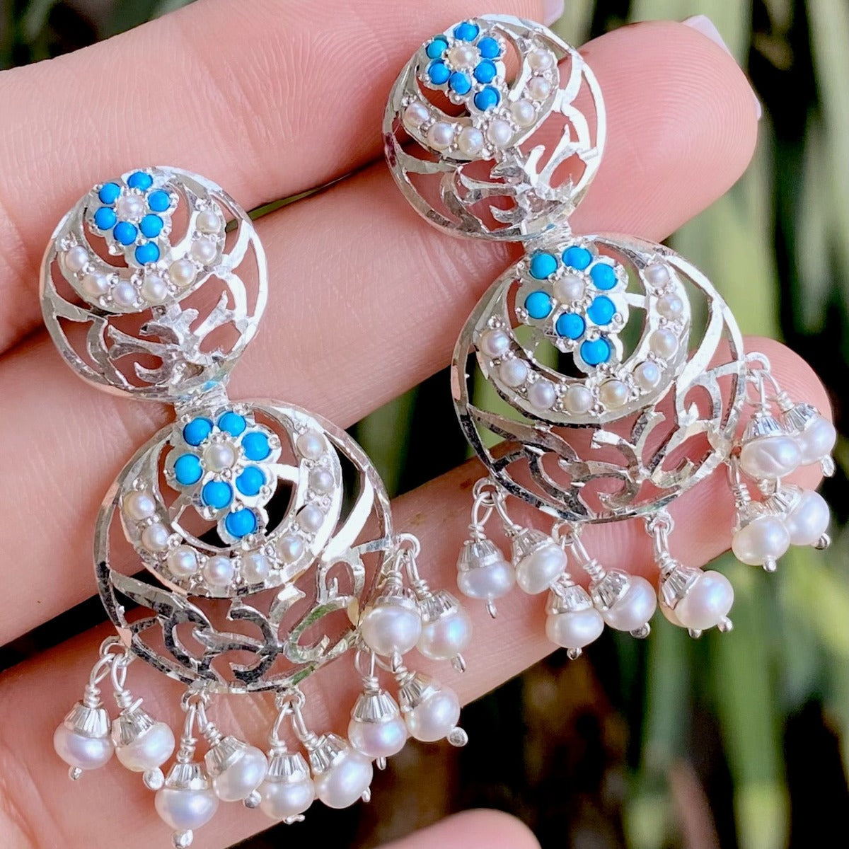 Featuring a dainty pair of earrings in white sterling silver. The earrings are studded with pearls and turquoise and close with a bombay screw mechanism