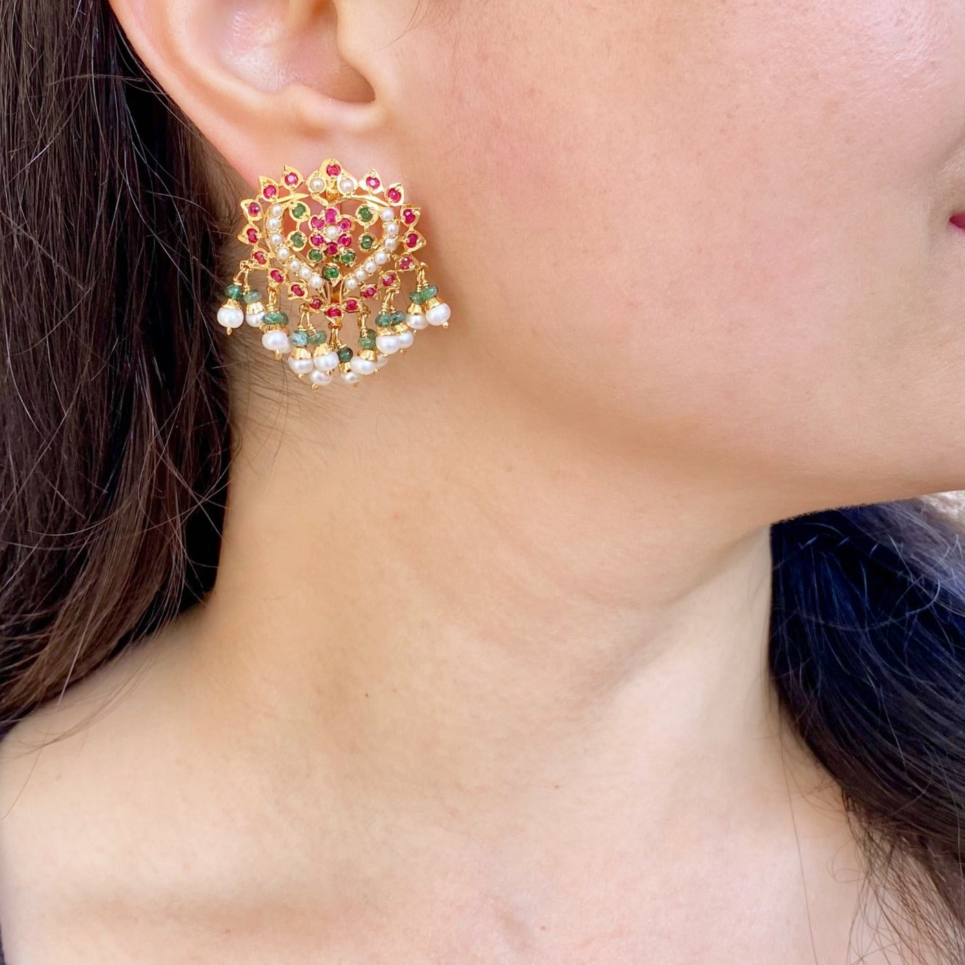 Featuring a pair of studs made in sterling silver with gold plated. They are studded with pearls, ruby like red stones and emerald like green stones. The hanging beads comprise pearls and real emeralds. The earrings close with a bombay screw.
