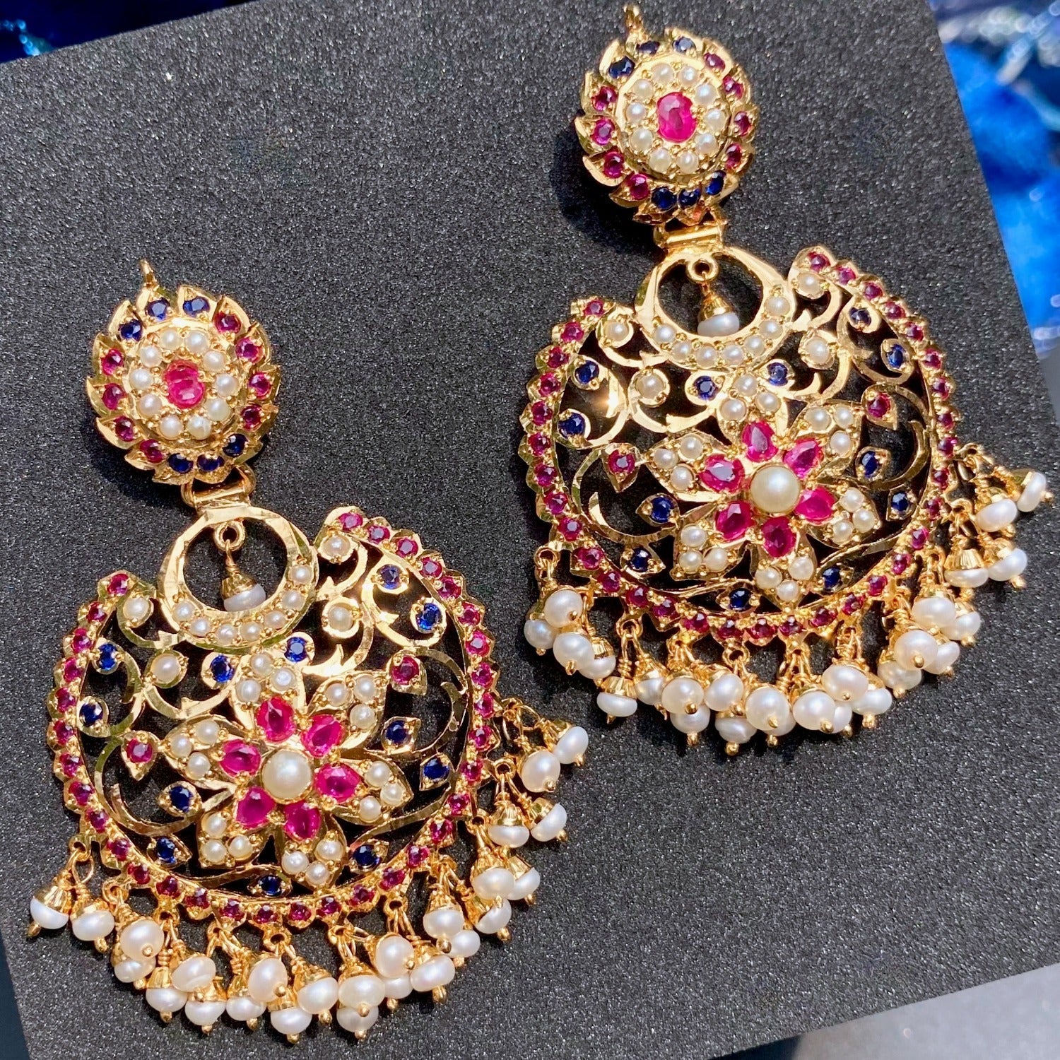 The studded stones are blue sapphire like blue stones, ruby like red stones and freshwater pearls. The hanging beads are freshwater pearls. The earrings close with a threaded bombay screw.