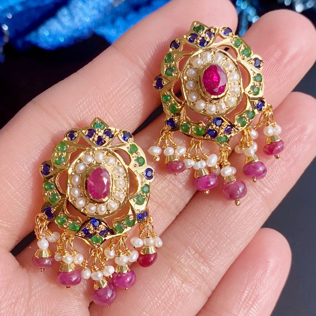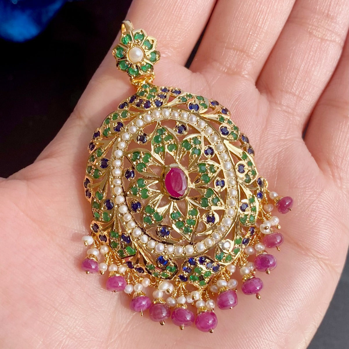 Featured is a medium sized pendant with a matching pair of studs in gold plated sterling silver. The setting stones comprise precious freshwater pearls and synthetic red,green & blue stones that resemble rubies, emeralds and blue sapphires.