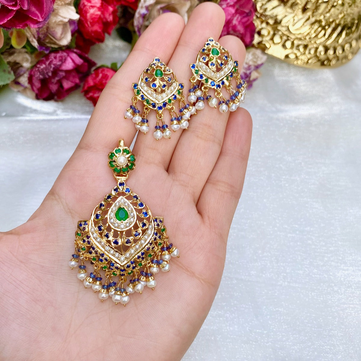 Pendant set made in sterling silver with 22K gold plating. Set with freshwater pearls and synthetic emeralds and blue sapphires. The hanging beads are real blue sapphires and freshwater pearls. The earrings close with a bombay screw.