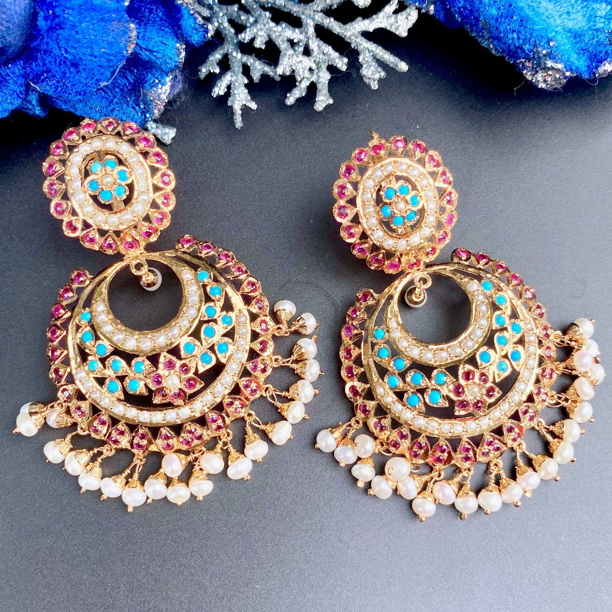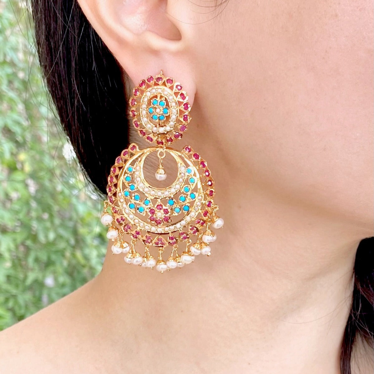 Featuring a pair of gold plated chandbali earrings. Handcrafted in 925 sterling silver and embellished with precious pearls, turquoises and ruby look alike stones. The earrings close with a bombay screw.