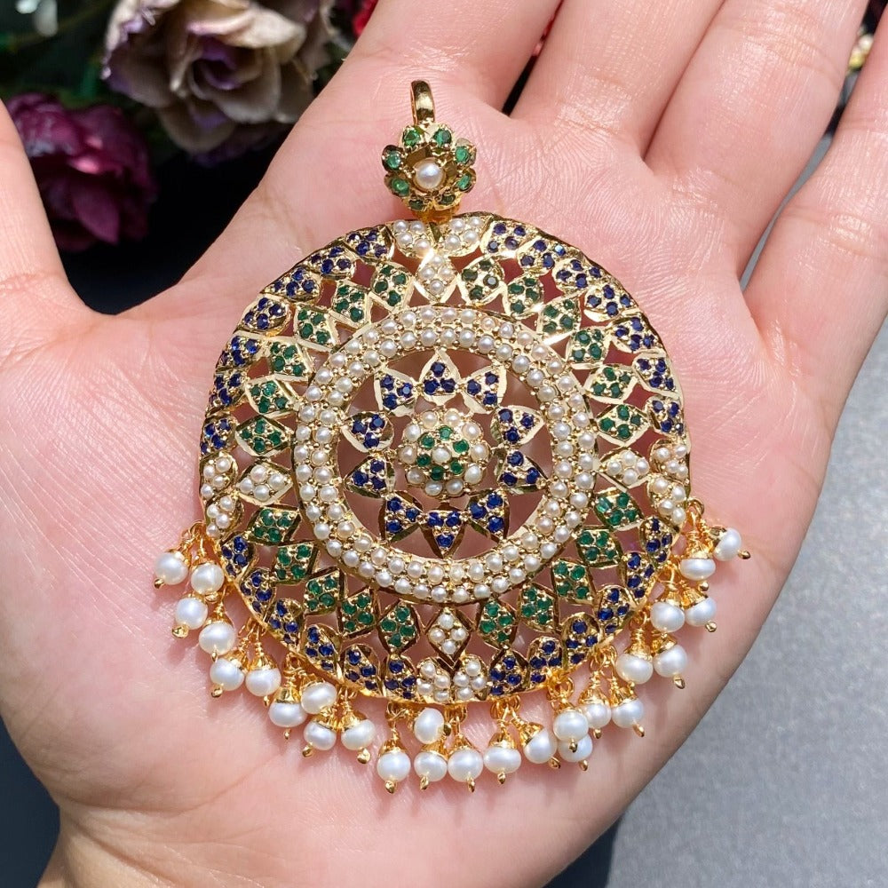 Featuring a finely crafted rajasthani style pendant set in gold plated silver. It has been embellished with precious pearls and sapphire emerald look alike stones. This pendant set is an ideal choice for those seeking a timeless piece of jewelry to keep forever. It offers an irresistible blend of intricate detail and luxury that will add an elegant touch to any look.