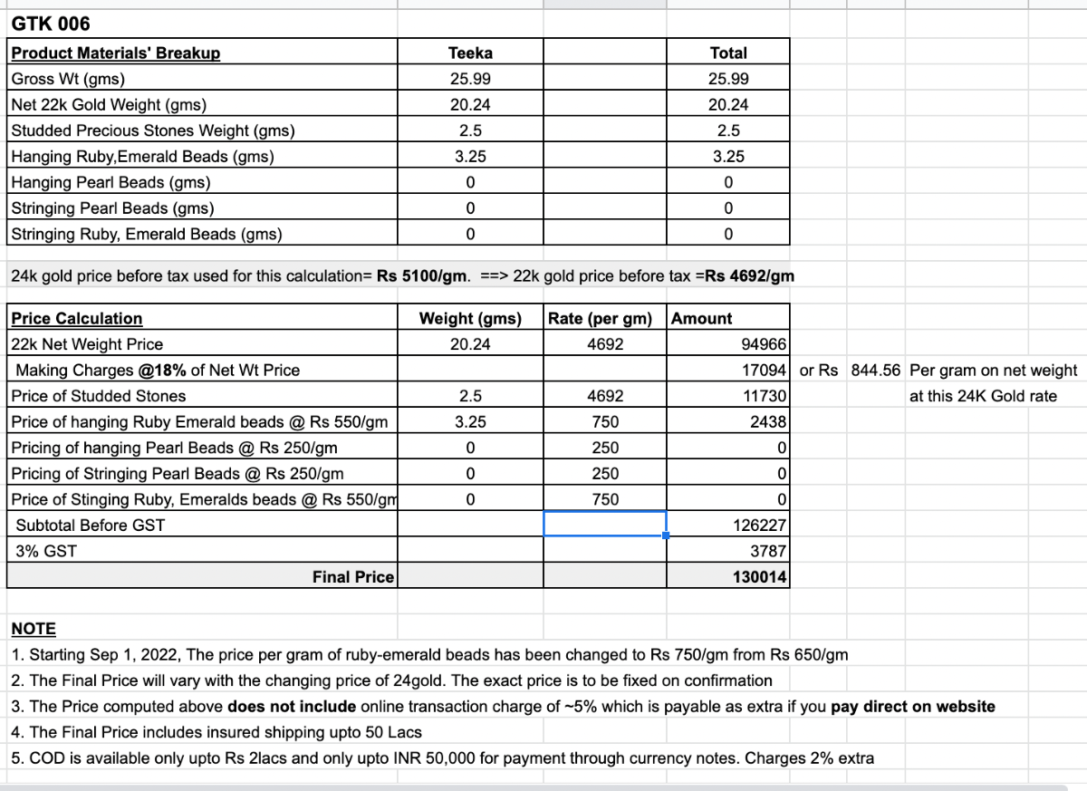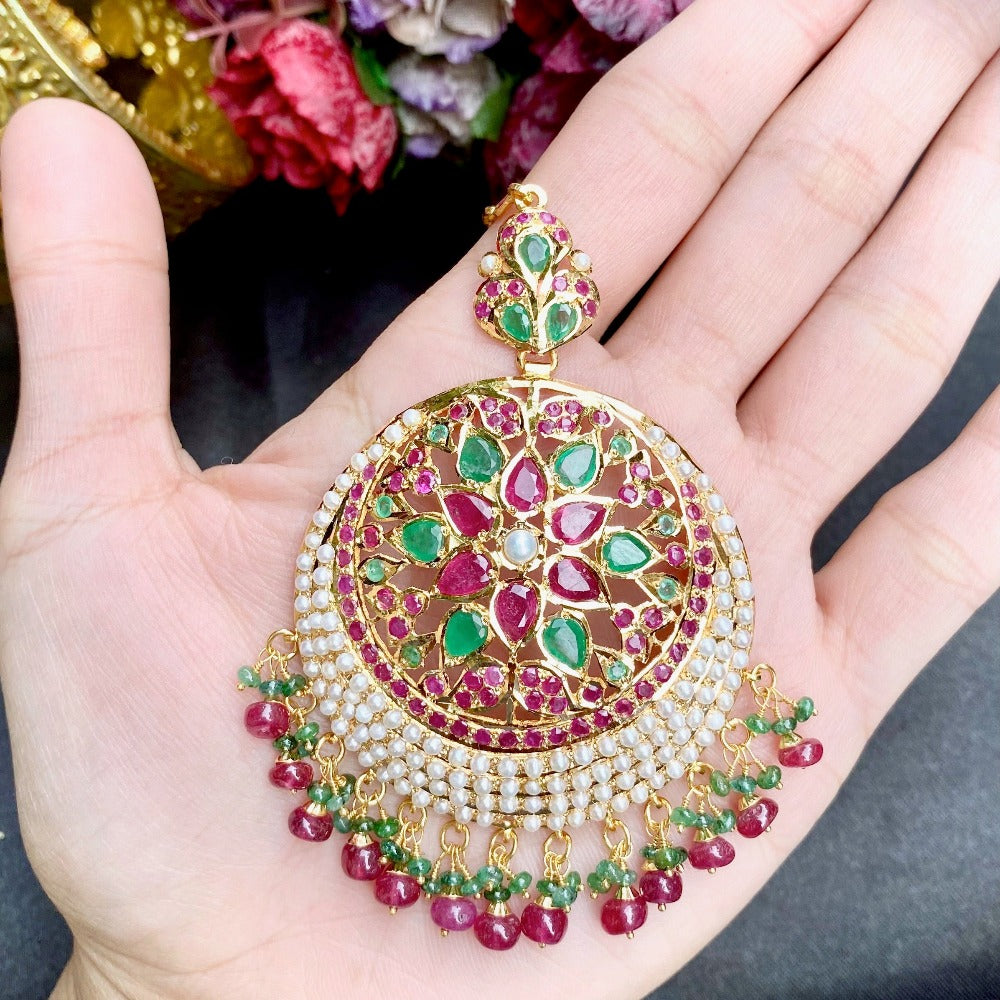 Featuring a large bridal jadau mang teeka in 22k gold set with precious rubies, emeralds and pearls. The teeka weighs 26gms in gross including 3.25gms in hanging rubies and emeralds.