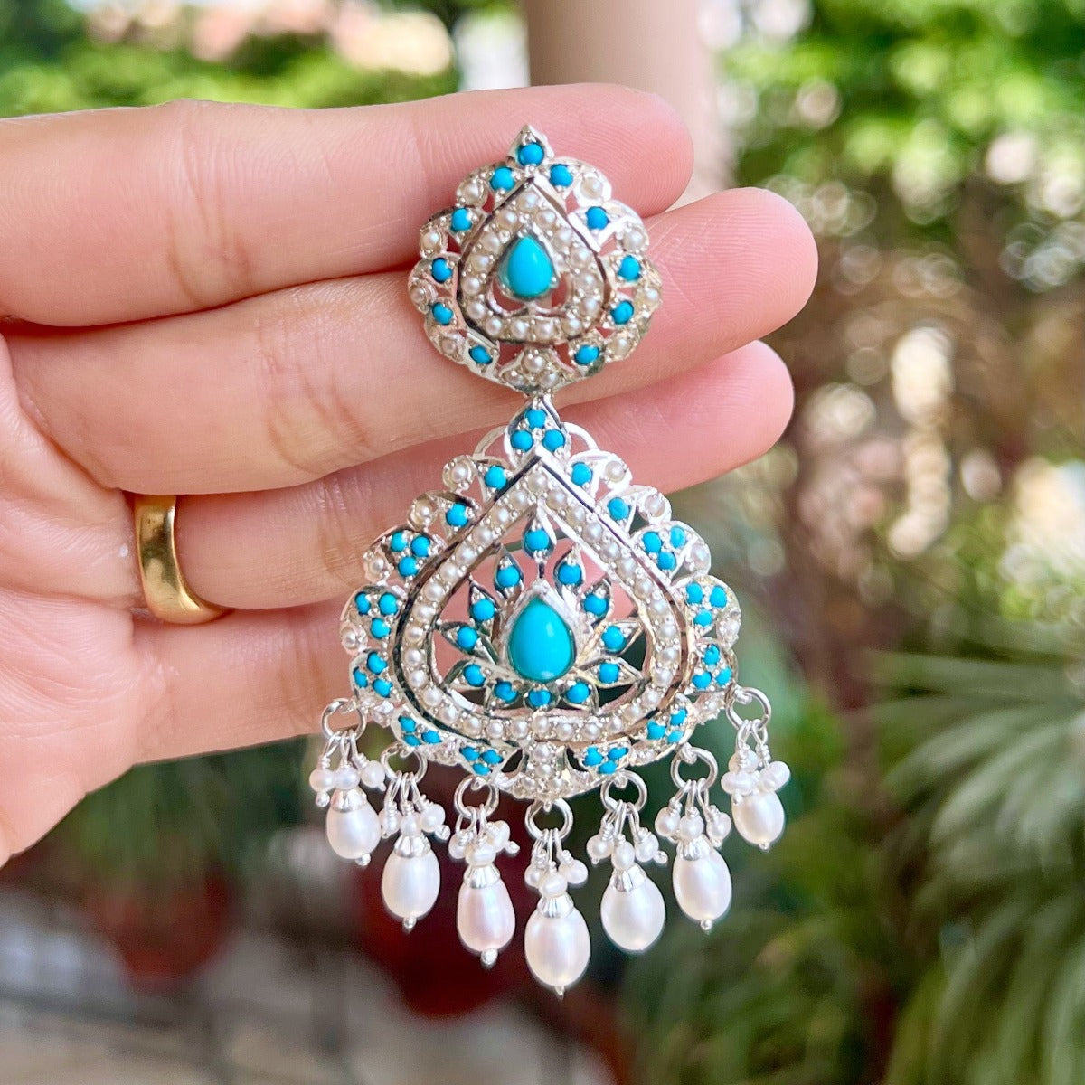 Featuring a pair of earrings on sterling silver studded with freshwater seed pearls and turquoises. The earrings are finished with freshwater pearl drops and close with a bombay screw.