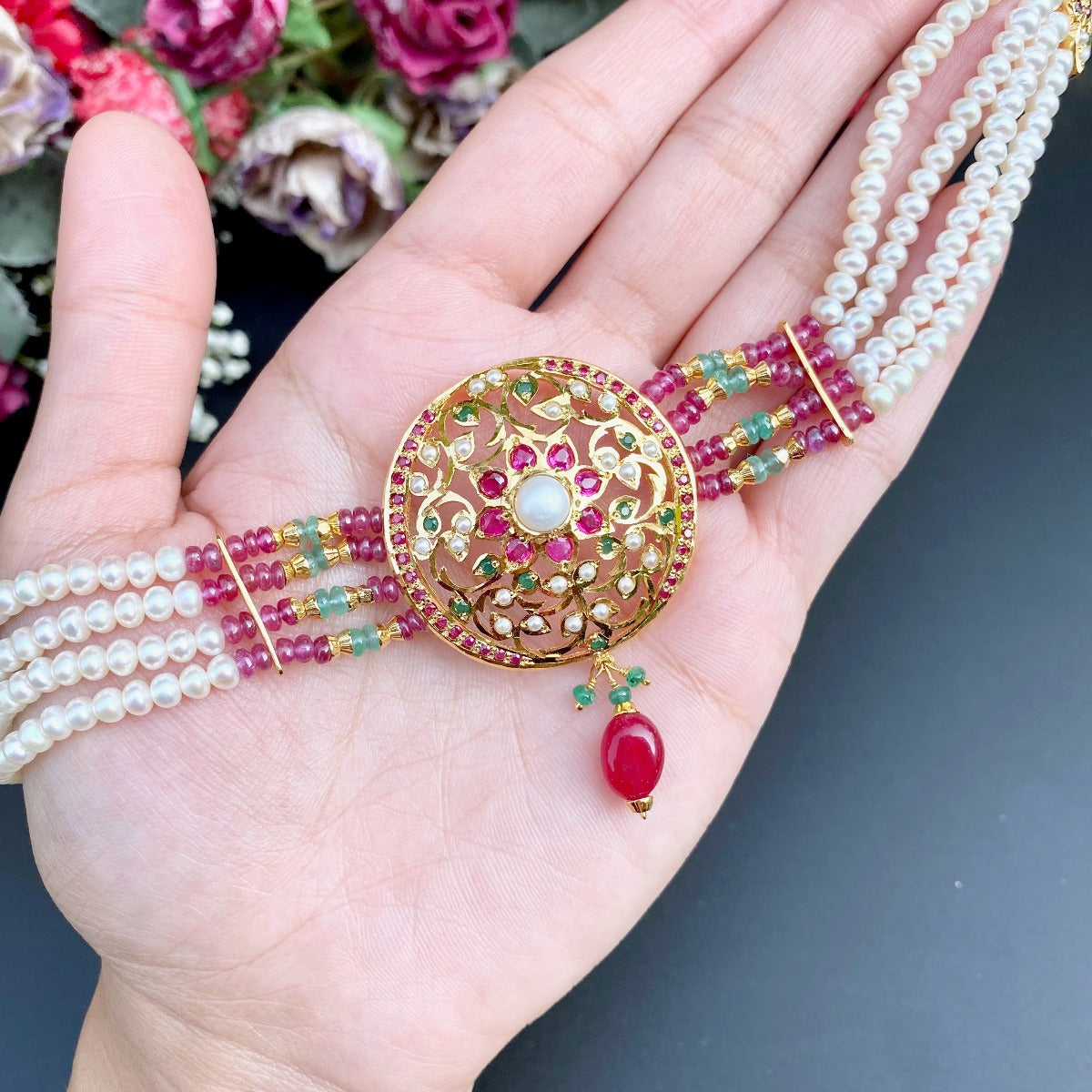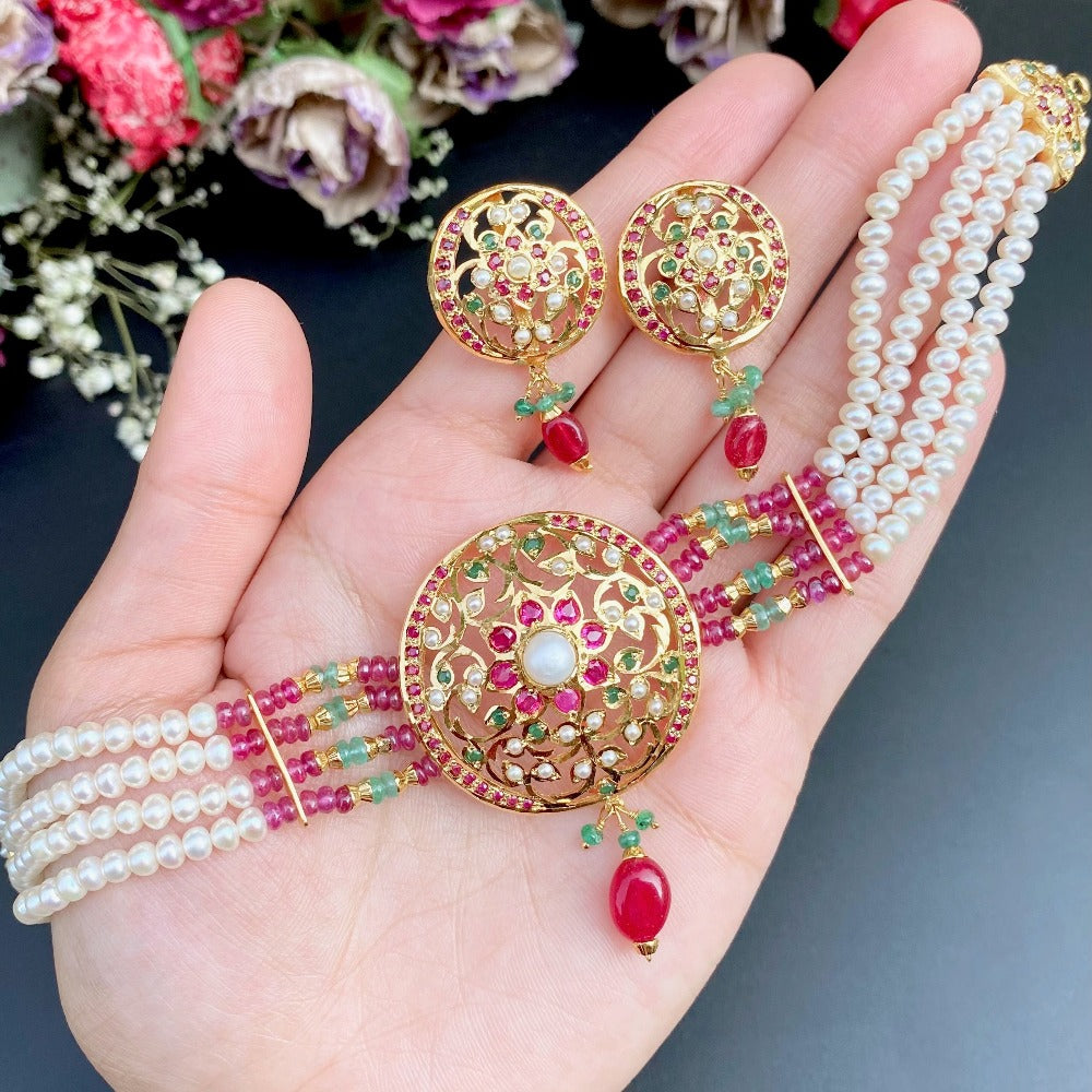 Featuring a multicoloured choker necklace with matching stud earrings in gold plated silver. The strings comprise of freshwater pearls and natural rubies and emeralds. The studded stones are freshwater pearls and synthetic red green stones that resemble rubies and emeralds. The choker is roughly 8 inch in length and comes with a fancy tassle.