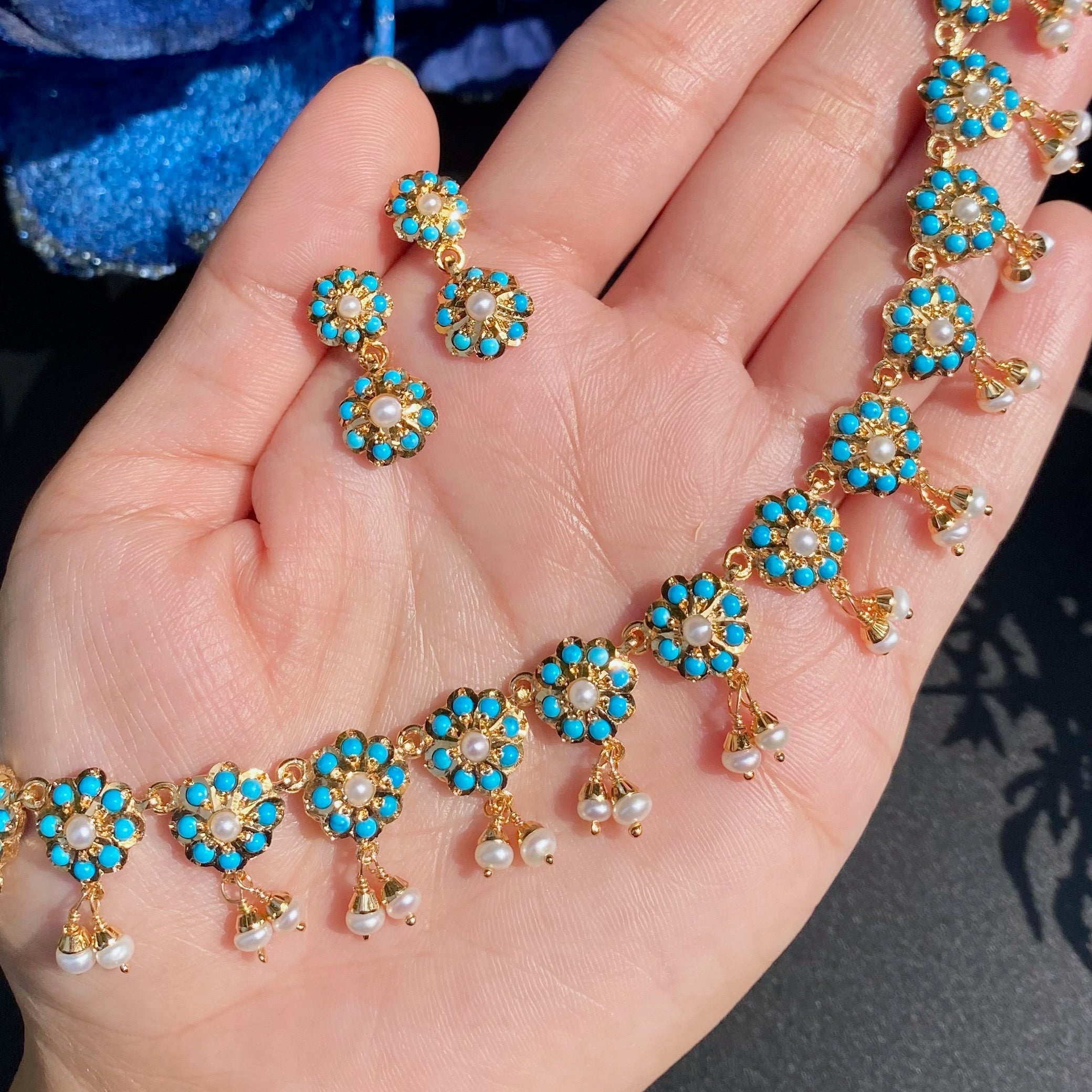 Dainty Pearl Turquoise Necklace with 2-Step Floral Earrings | 925 Silver Gold Plated Jewelry For Women in USA NS 488