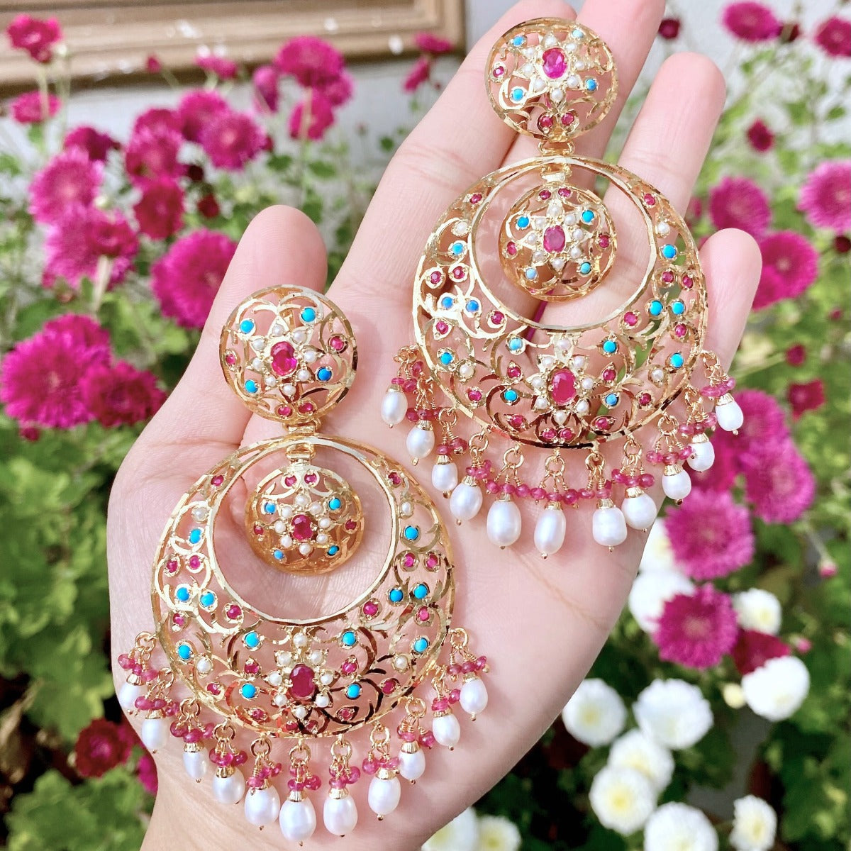 Featuring a pair of large chandbali earrings, made on 925 silver with gold plating. The chandbali is embellished with freshwater pearls, turquoises and red stones that closely resemble rubies. The hangings comprise pearl drops and real ruby beads. The earrings close with a bombay screw.