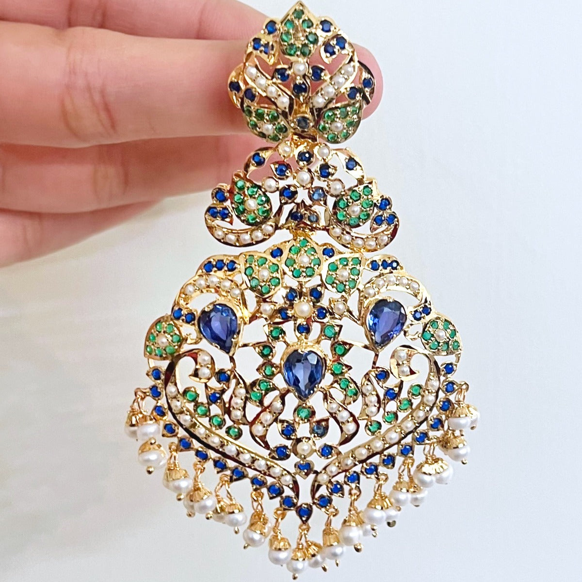 Indulge in the opulence of the Mughal era with these exquisite jadau earrings. Handcrafted using the finest 925 sterling silver, they are adorned with lustrous freshwater pearls and vibrant green blue stones that resemble emeralds and sapphires, elevating your style with a touch of regal elegance. Immerse yourself in the luxury and prestige of these timeless treasures.