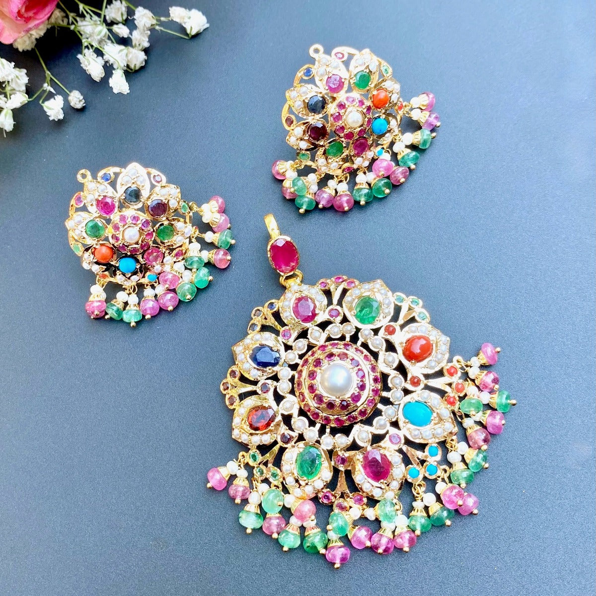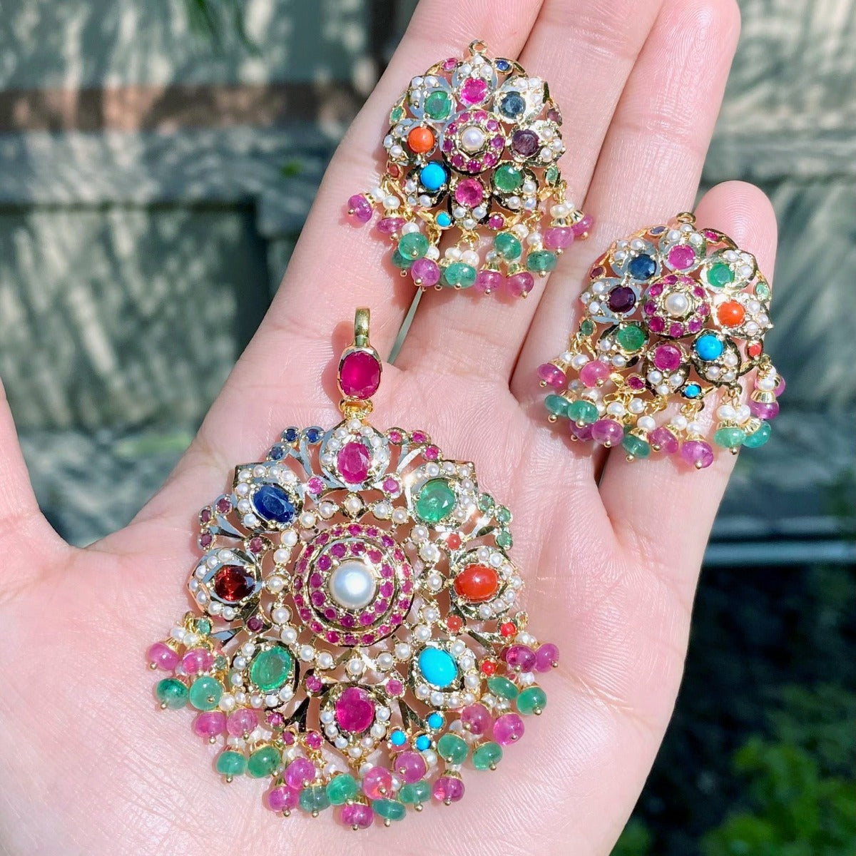 Alluring Pendant sets | 22K Gold Indian Jewelry in USA | Navaratna & Pearls Studded GPS 018