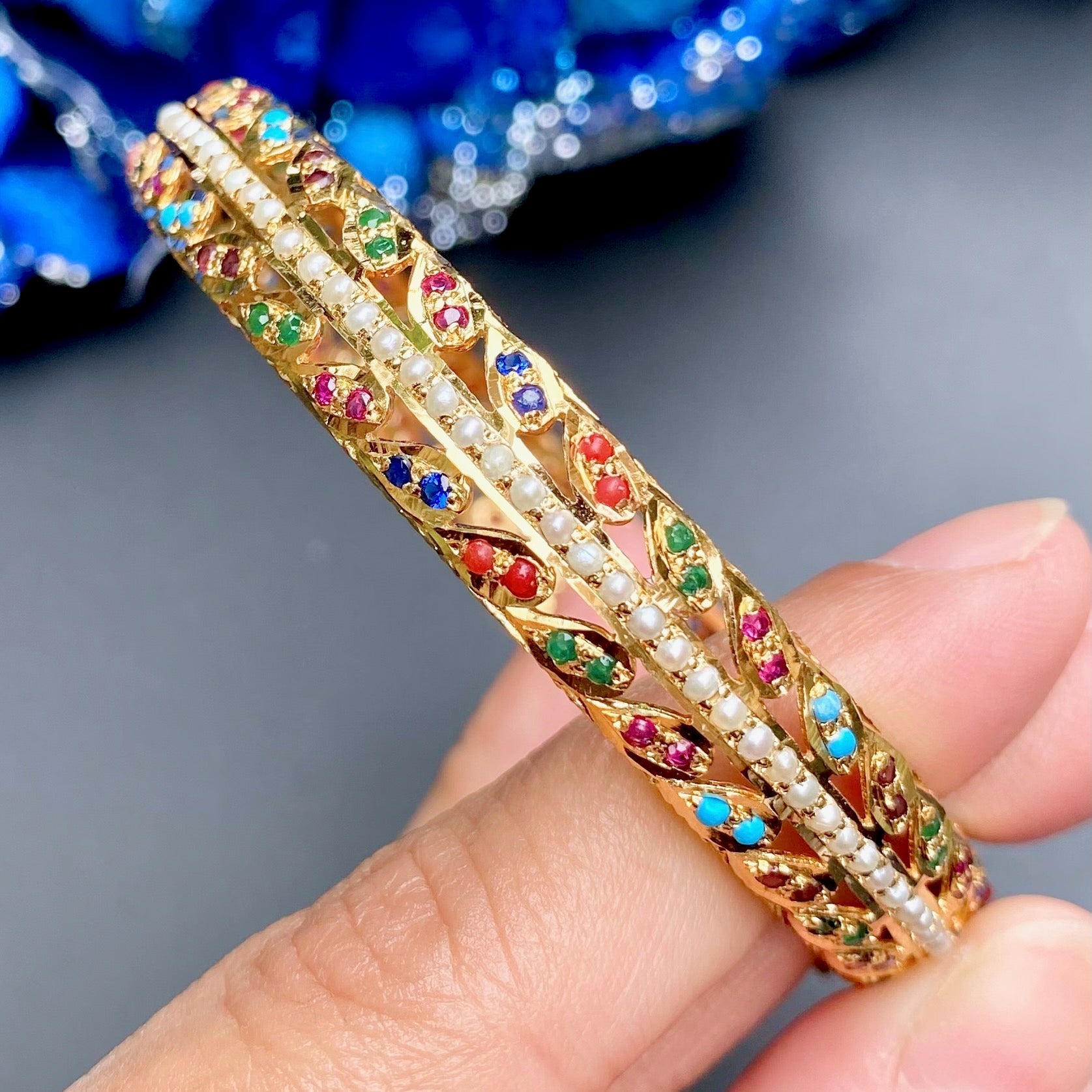 Enjoy timeless elegance with our Navaratna bangle featuring stunning gold plating and intricate jadau detailing in a vibrant array of colors. This exquisite piece will elevate any outfit and bring a touch of luxury to your jewelry collection.