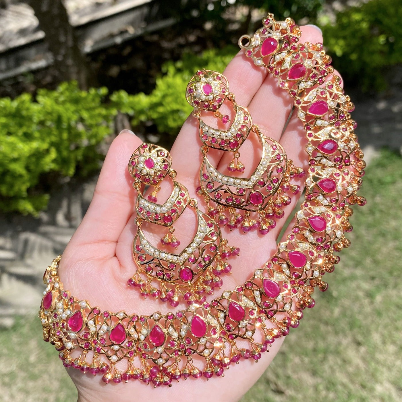 Elevate your style with this exquisite gold plated ruby necklace made on sterling silver. The studded stones are ruby like red stones and freshwater pearls. The hanging beads are real rubies. Crafted with care and precision, this luxurious piece will add a touch of sophistication to any outfit. Experience the beauty and opulence of fine jewelry with this stunning necklace.