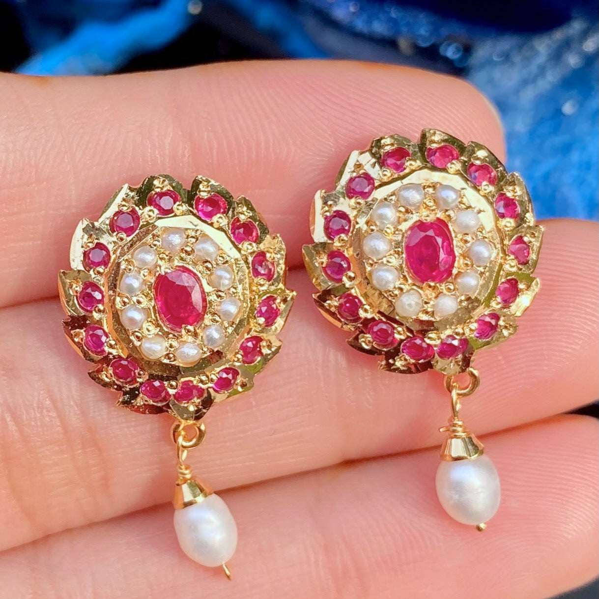 Featuring a pair of jadau studs made on sterling silver with gold plating. The studded stones comprise freshwater pearls and red stones that resemble rubies.