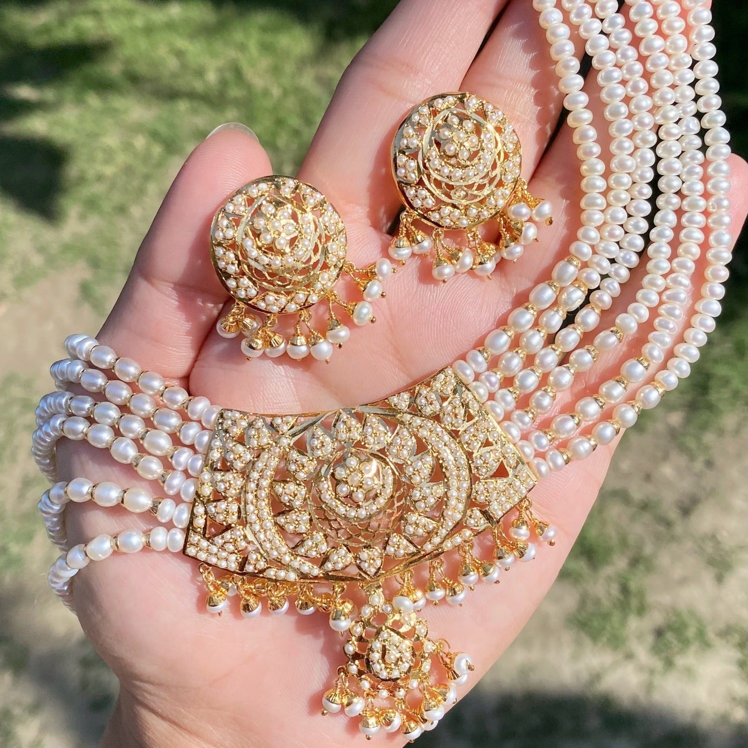 Featuring a classy jadau choker set made on sterling silver with gold plating. This fine design is embellished with precious freshwater seed pearls. The hanging and stringing beads are also freshwater pearls. The necklace is supplied with a fancy fabric tassel and the earrings close with a bombay screw.