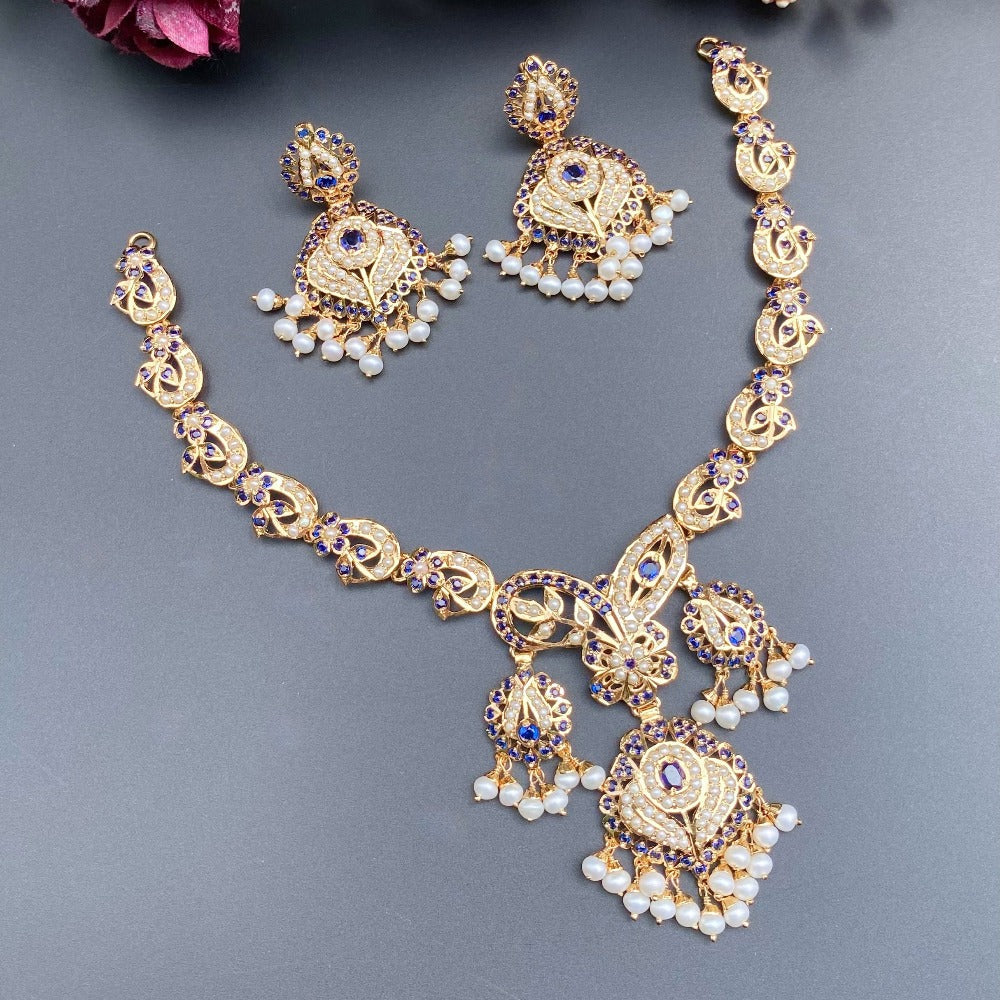 Featuring a beautiful necklace set in gold plated silver. It has been studded with precious pearls and finest quality of blue sapphire look alike stones. The necklace is made of high-grade material, providing long-lasting sparkle that you can show off with confidence.