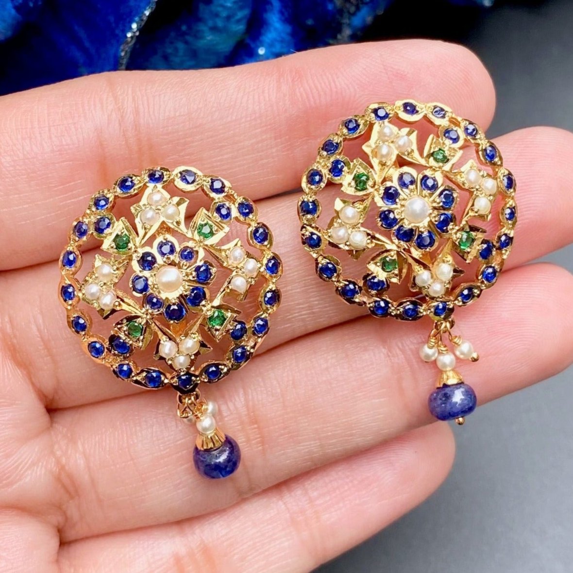 Revamp your style with these versatile stud earrings. Delicately crafted in silver with luxurious gold plating, these earrings add an opulent touch to any outfit. The studded stones are blue sapphire like blue stones, emerald like green stones and freshwater pearls. The earrings close with a threaded bombay screw.