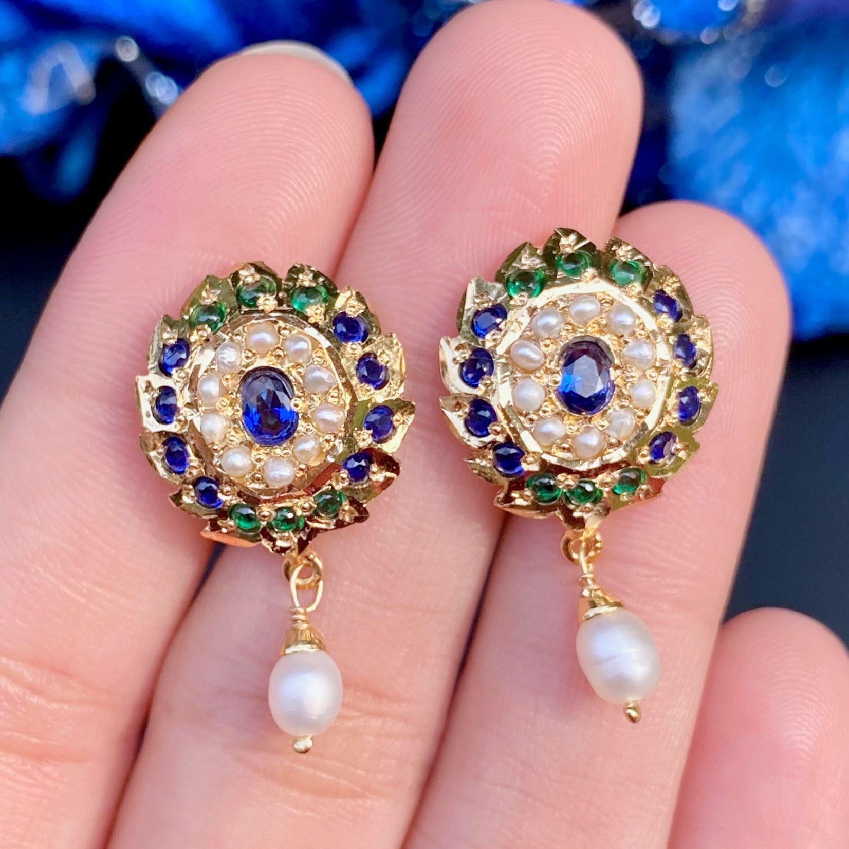 Featuring a pair of jadau studs made on sterling silver with gold plating. The studded stones comprise freshwater pearls and blue-green stones that resemble blue sapphires and emeralds.