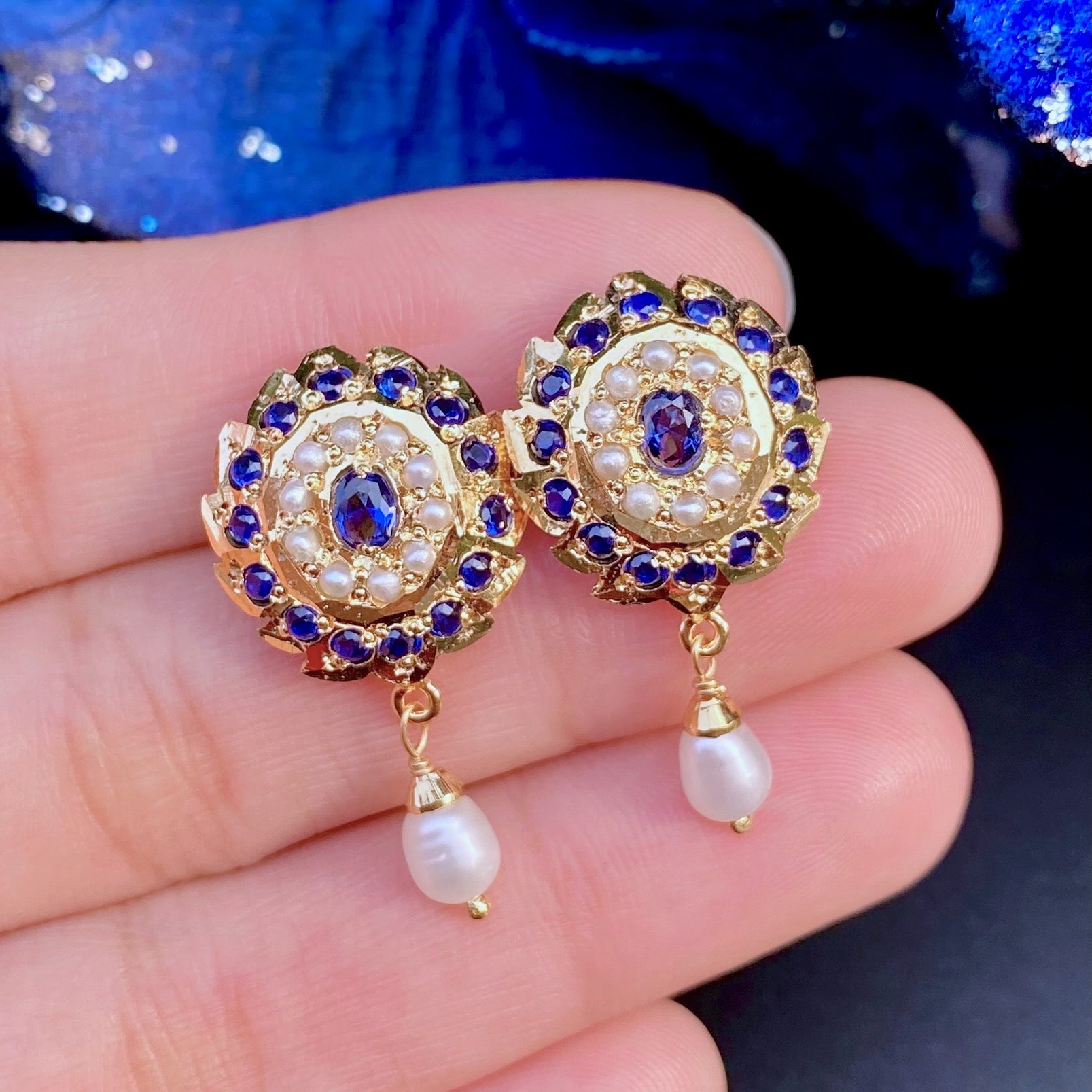 Featuring a pair of studs made on sterling silver with gold plating. They have been embelished with freshwater pearls and navy blue stones that resemble blue sapphires. The earrings close with a bombay screw.