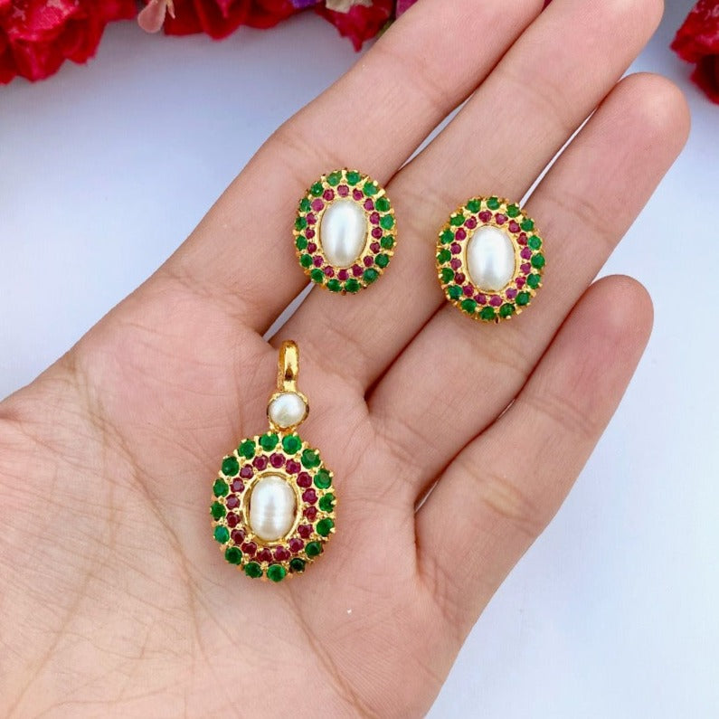 Jadau pendant set with matching earrings made in sterling silver with 22K gold plating. It has been embellished with freshwater pearls and synthetic rubies and emeralds.