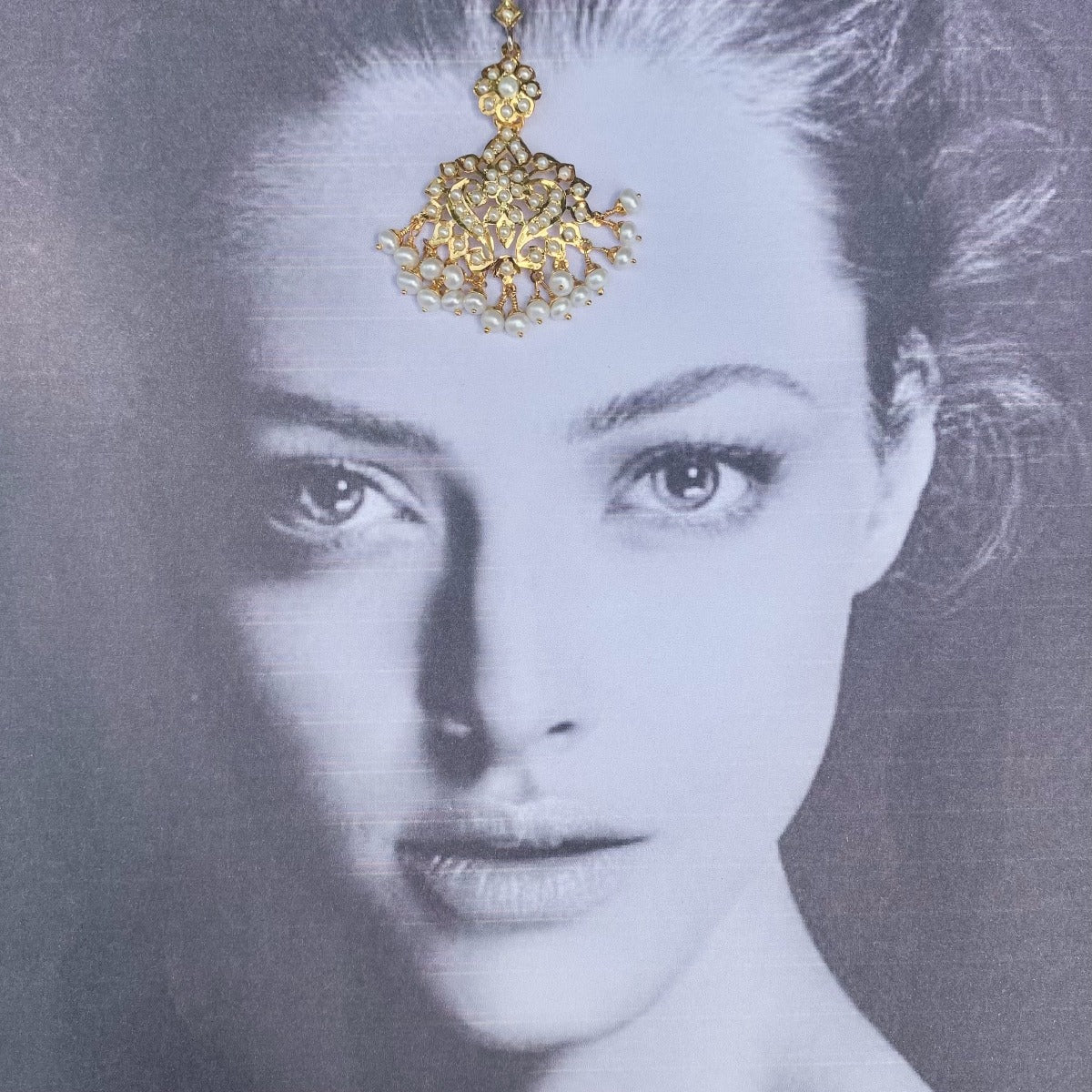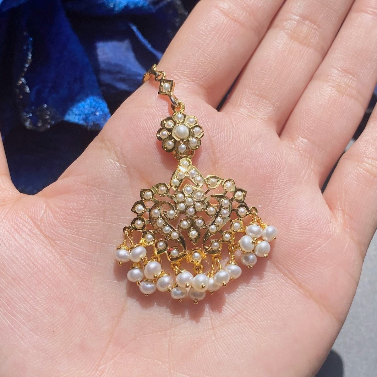 Featuring an evergreen classic maang teeka in gold plated silver. It has been embellished with precious freshwater pearls.