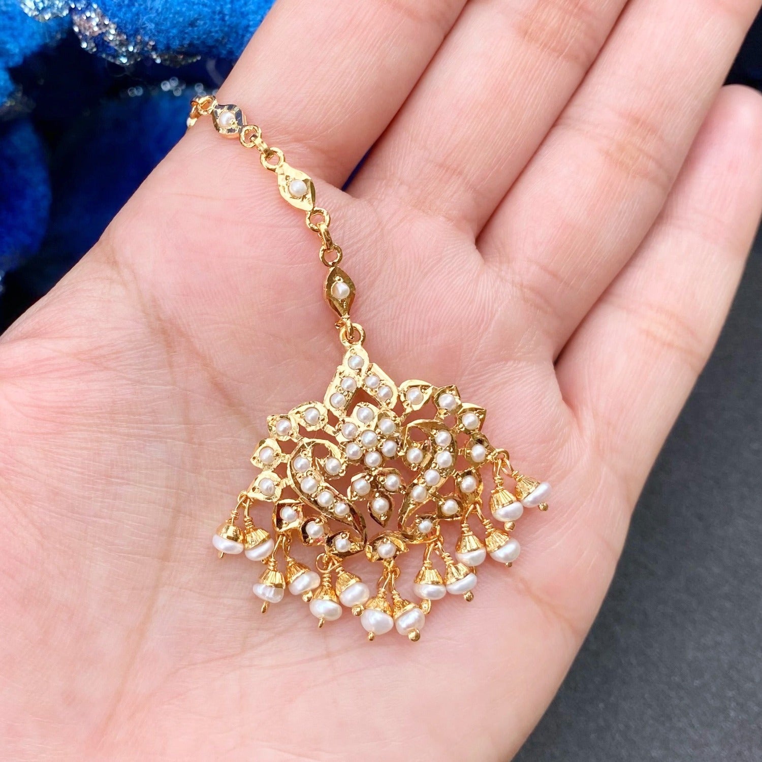 Simple Pearl Maang Teeka for Women | Freshwater Pearls on Sterling Silver | Gold Plated TK 079