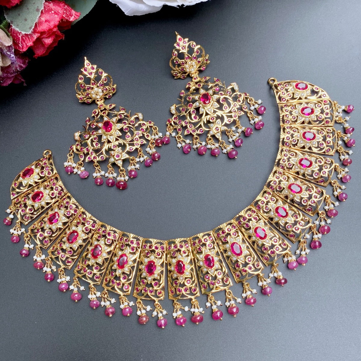 Featuring an intricately crafted necklace set made in sterling silver with 22ct gold plating and embellished with rubies and pearls.