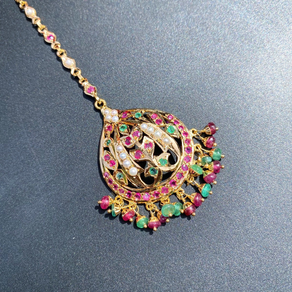 Featured is a small mang teeka in 22k gold studded with rubies, emeralds and pearls. The teeka's chain is approx 4inches in length and has a hook at the end. The teeka weighs 9.82 gms including 0.86 gms in the hanging ruby-emerald beads.
