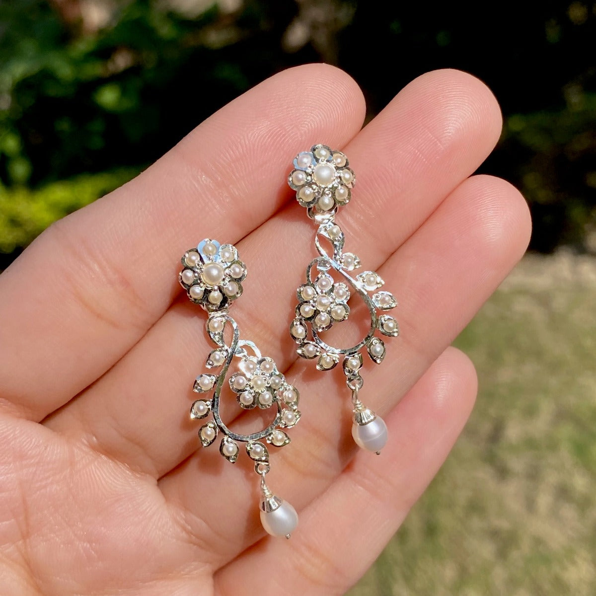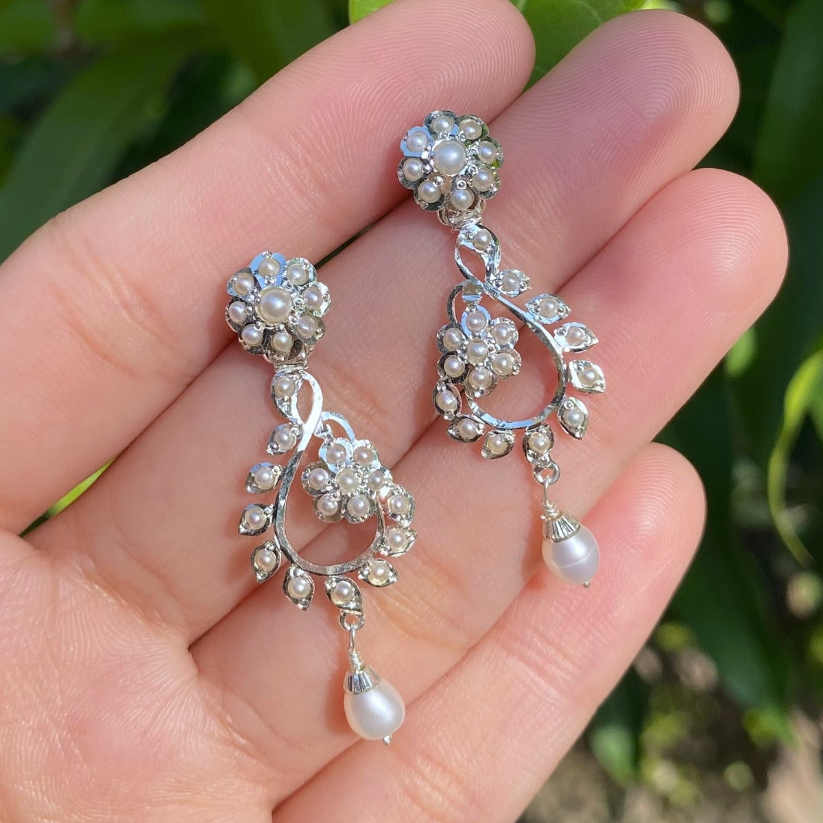 Featuring a pair of dainty indo western design earrings crafted in 925 sterling silver and embellished with precious pearls. The earrings are ultra light to wear and close with a bombay screw mechanism.