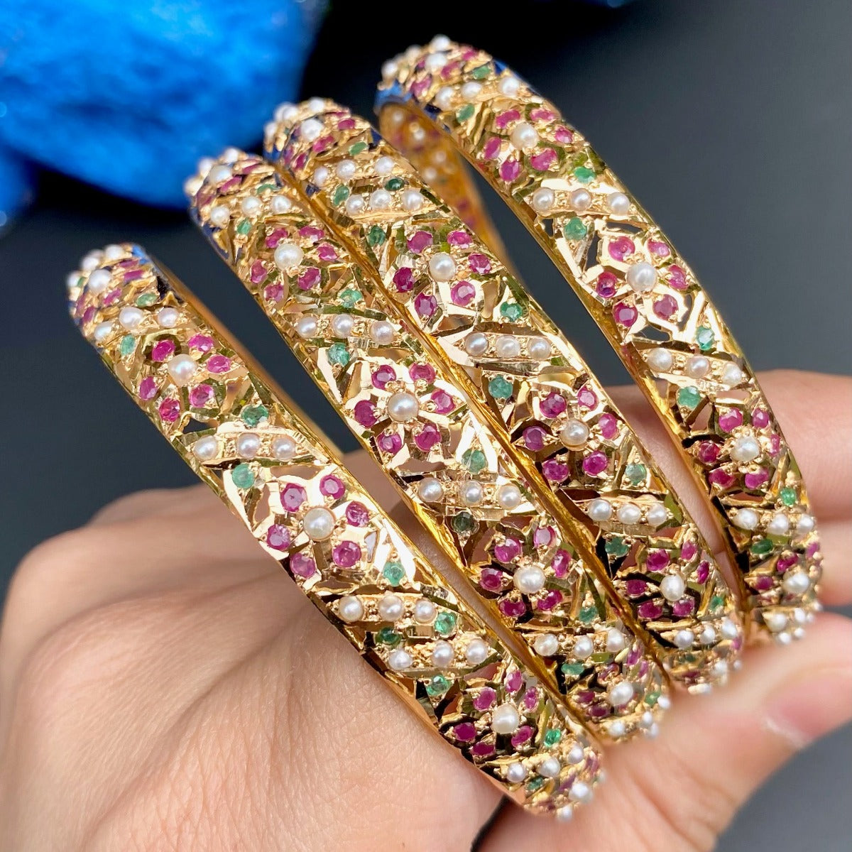 Featuring a set of 4 jadau bangles (kangan or chudiyan) made in 22ct gold, studded with ruby emerald and pearls . Traditionally bridal wear. These exquisitely crafted pieces are perfect for special occasions when just any gold jewel won't do. Adorn yourself with a timeless symbol of sophistication and luxury.