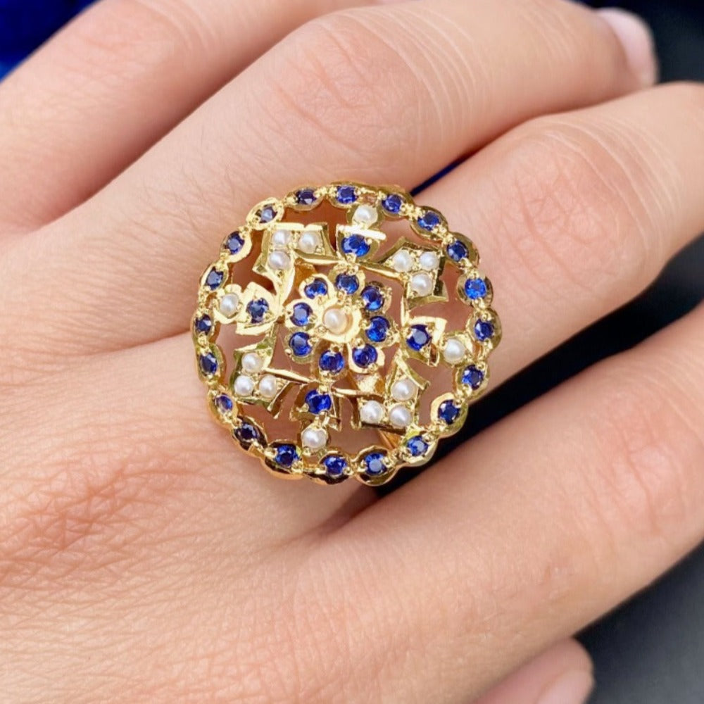 Featuring an adjustable pearl and blue sapphire ring made in sterling silver with 22k gold plating.