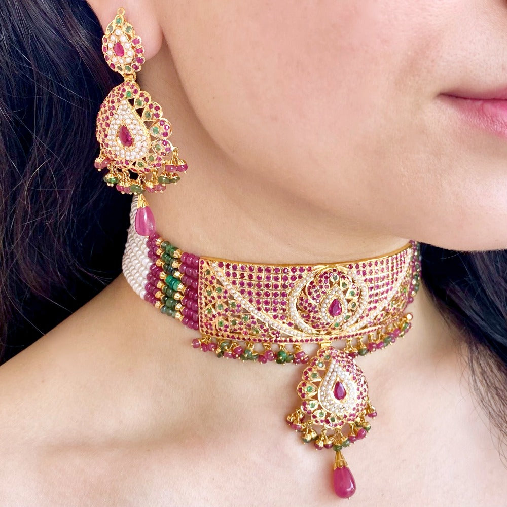 Featured is a 22k gold jadau stiff type choker necklace with a matched pair of earrings. The base metal is hallmark 916 gold (22k gold) and the stones used are natural rubies, emeralds and freshwater pearls. The necklace weighs 61 gms in gross with 19.5gms as stringing pearls and ruby-emerald beads and the earrings weigh 20.5 gms. Perfect to pair with a bridal lehenga or saree.