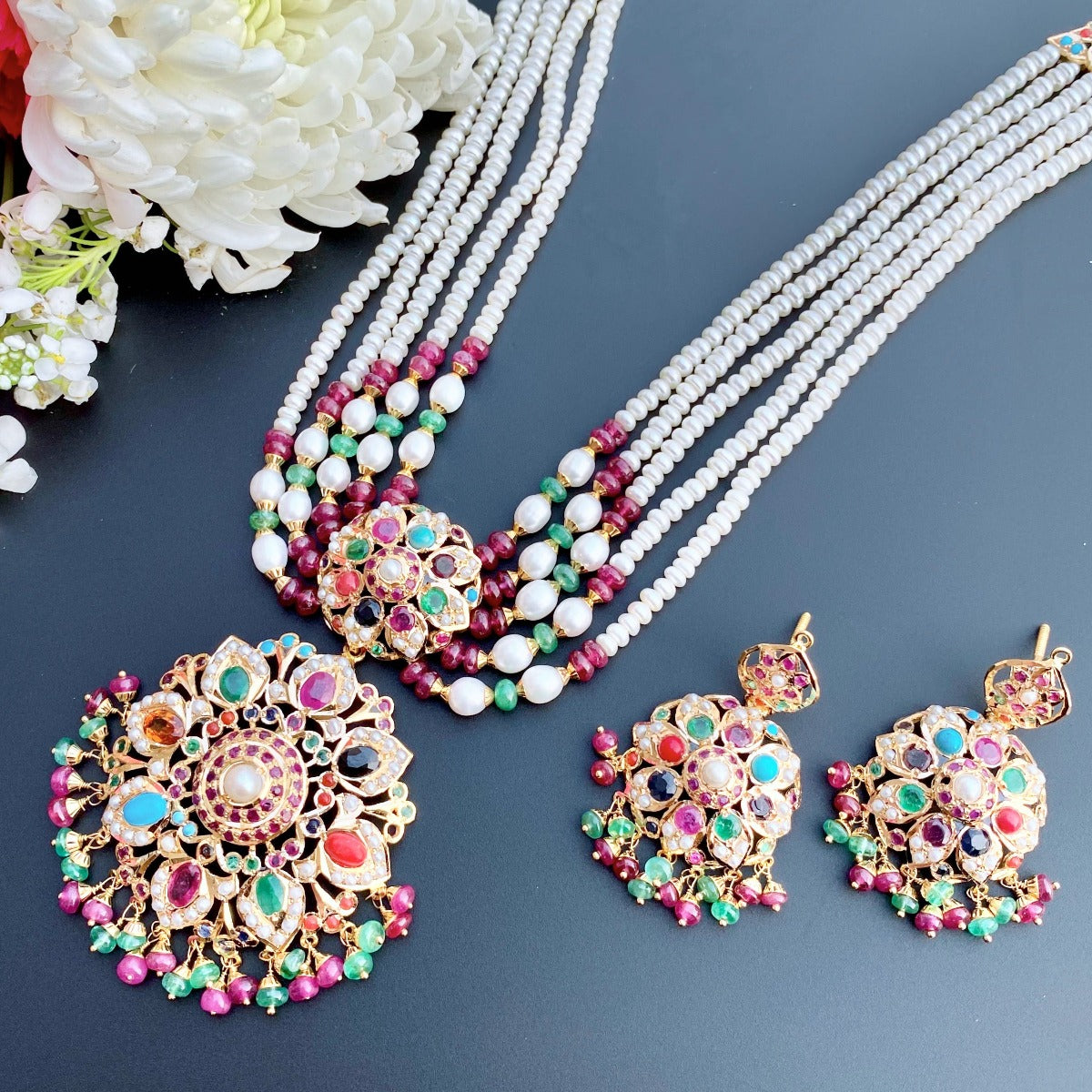 Featured is a contemporary jadau short rani haar set in ruby, emerald & pearl combination in 22k gold.