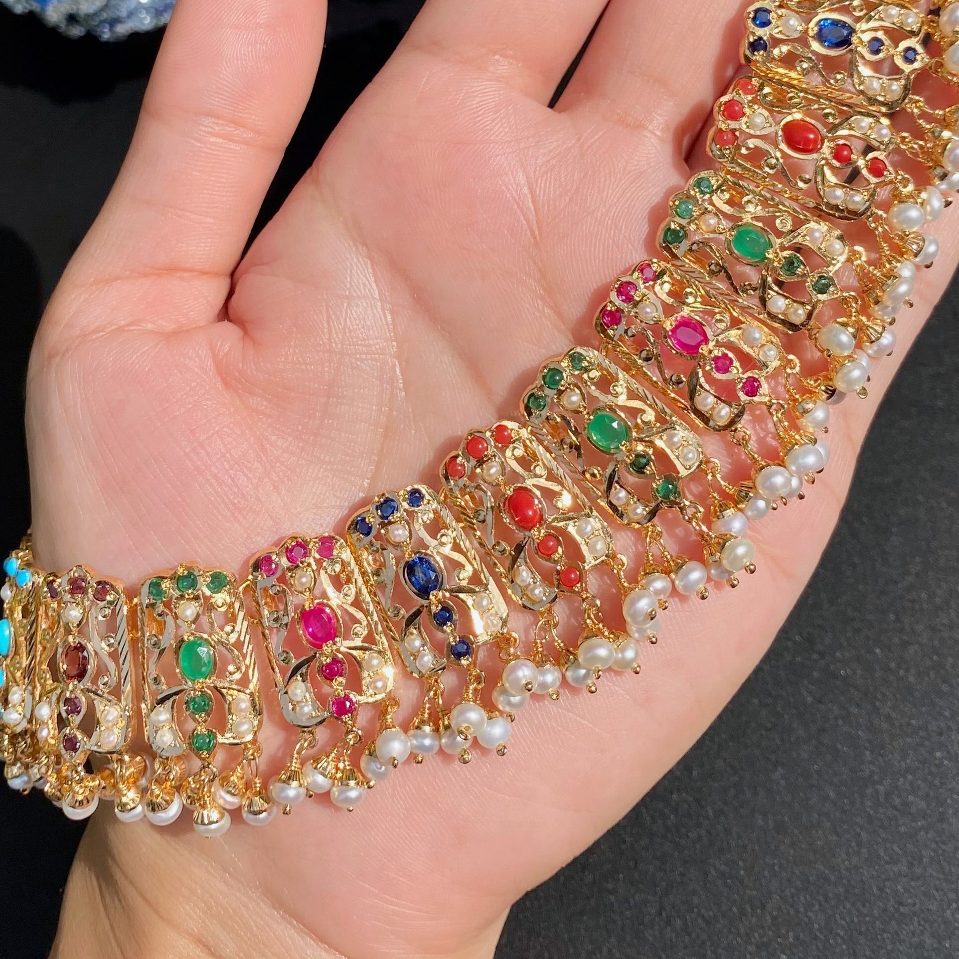 Featuring a classic handcrafted navrattan necklace set in gold plated sterling silver. Perfect for making a lasting impression at special occasions, this timeless design is sure to become a treasured family heirloom.