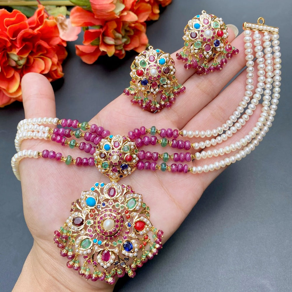 Featuring a navrattan necklace set made in 22ct gold and set with freshwater pearls and navrattan stones.