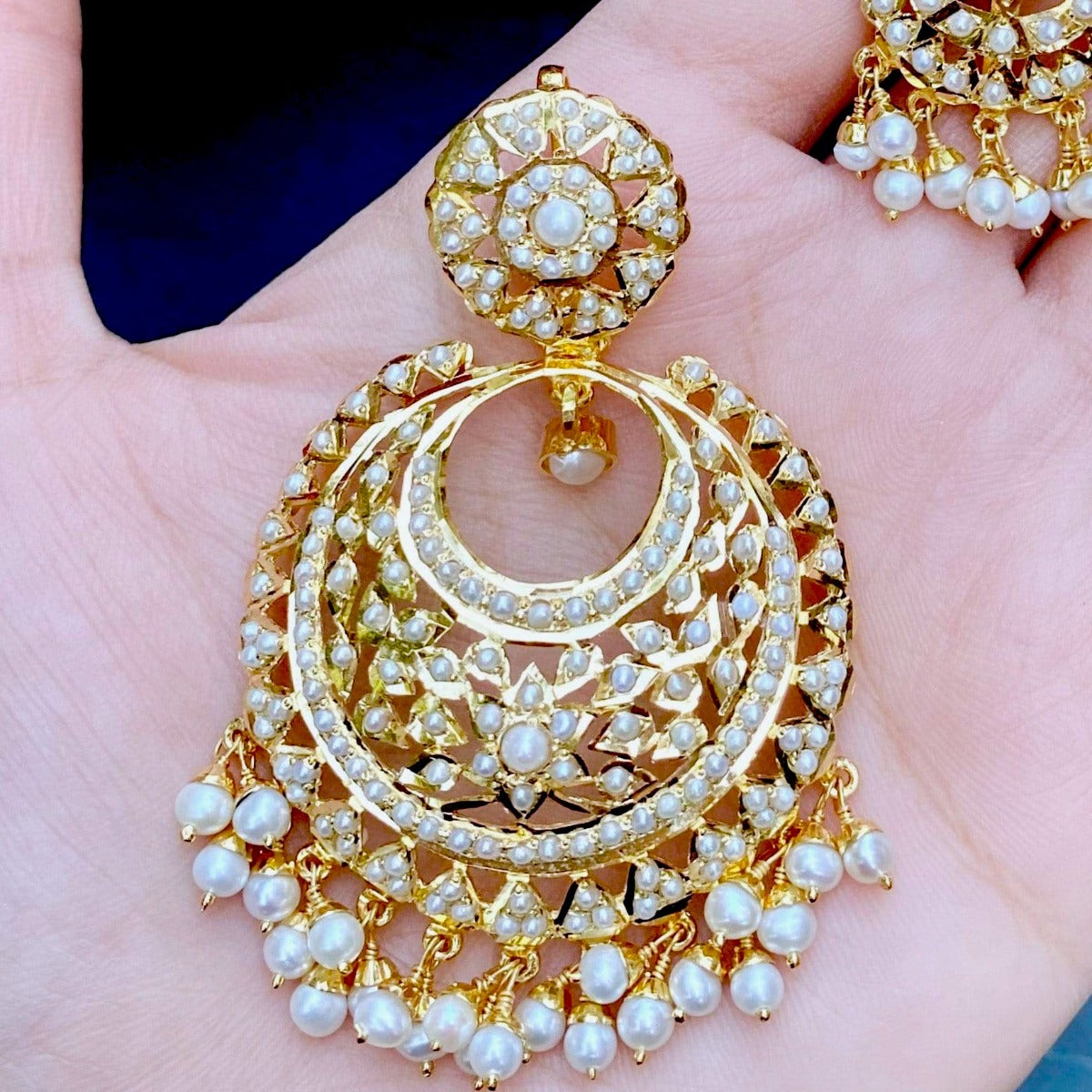 Featured is a chandbali shaped pendant with matching studs in gold plated sterling silver embellished with precious freshwater pearls.