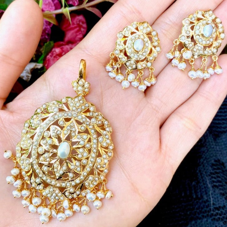 Featured is an intricate pendant set in gold plated sterling silver set with precious freshwater pearls. The hangings are freshwater pearls as well. The pendant set weighs about 21 gms