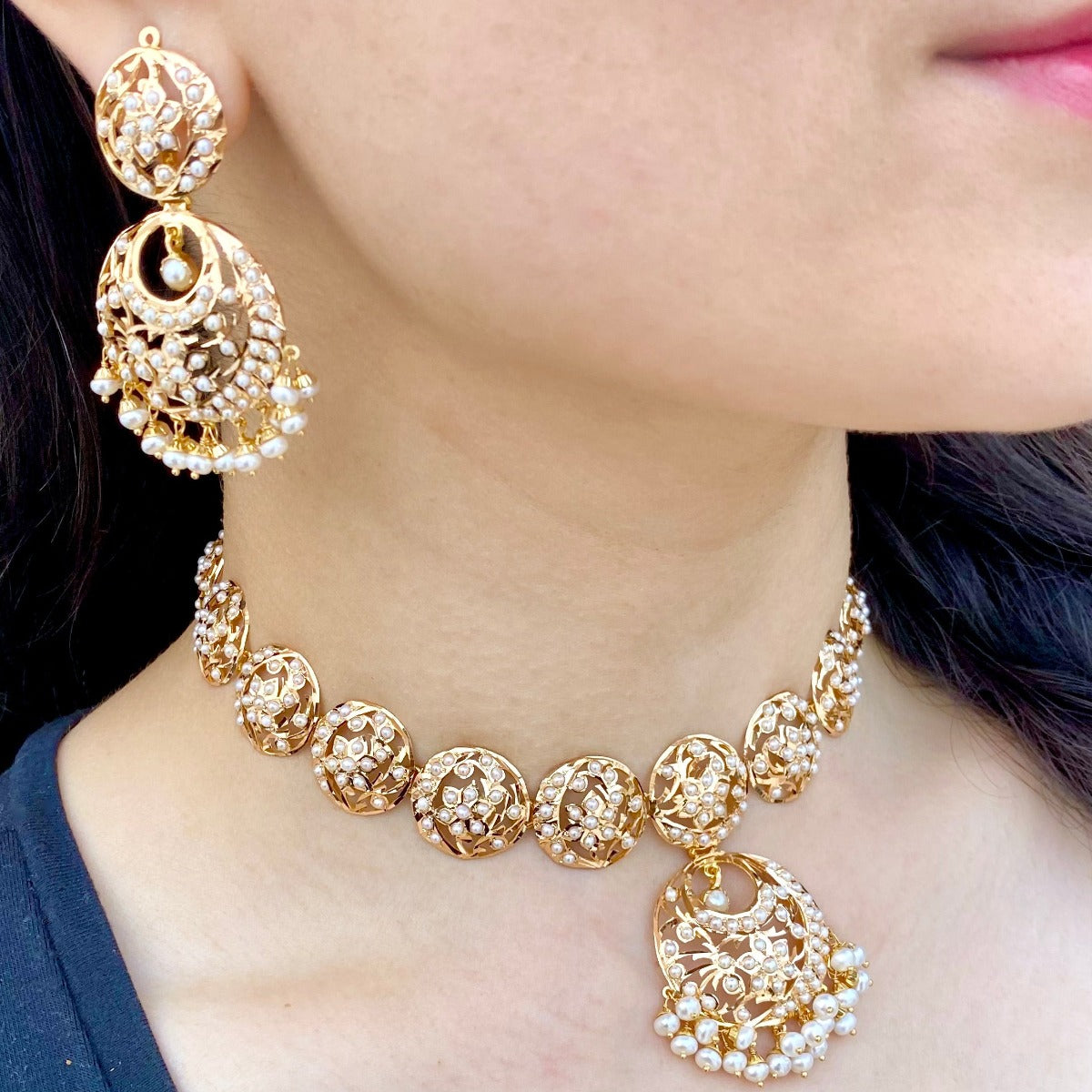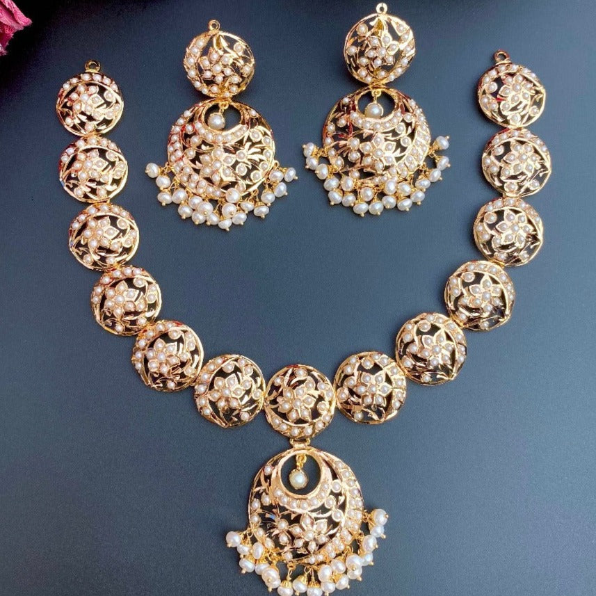 Pearl Necklace Set With Chandbali Earrings in 22 carat Gold GNS 040