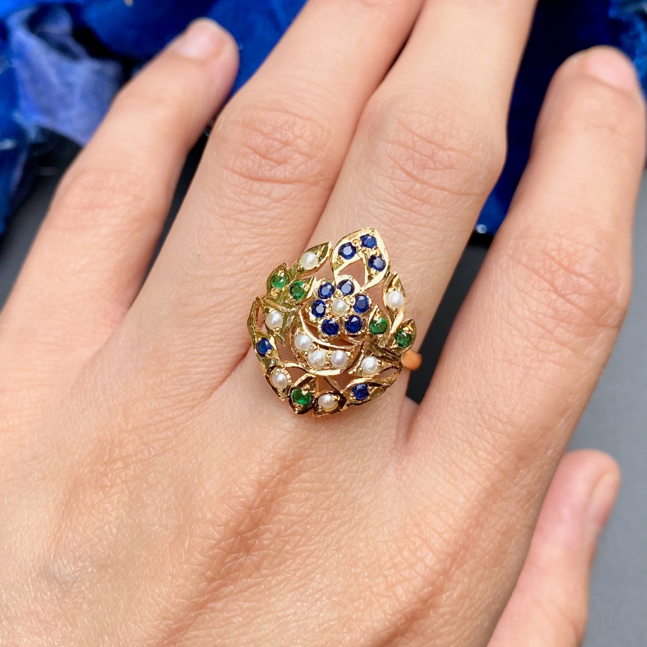The emerald & sapphire like green-blue stones and pearls add timeless elegance to the piece. The ring size is adjustable.